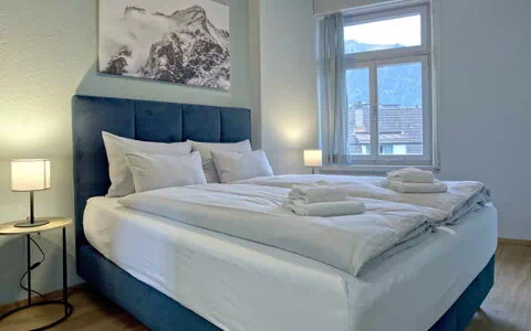 The modern, air-conditioned flat (33 m2) on the 3rd floor offers space for up to 3 people. Thanks to the successful combination of stylish elements and a warm, inviting atmosphere, the flat creates a pleasant feel-good ambience.The bedroom is furnished with a comfortable double bed (160cm x 200cm) to ensure a good night's sleep. The soft lighting and coordinated materials create a calm and relaxing atmosphere that is ideal for a restful night's sleep.The cosy living area is lovingly furnished and invites you to linger. Here you will find a comfortable sofa corner and a small dining area where you can enjoy your meals. The sofa bed offers space for an additional person, so that smaller groups or families can also enjoy a pleasant stay. The modern kitchen with cooking facilities, microwave, dishwasher and Nespresso coffee machine is fully equipped with everything you need for your stay. The accommodation offers free, shared laundry facilities.The flat is equipped with a 55-inch TV and high-speed internet for the best entertainment. For all film and series lovers, there is the option to connect to personal Netflix access.The bathroom is equipped with an elegant shower and WC. The modern tiles and high-quality furnishings give the room a pleasant atmosphere.The flat impresses with its brightness, which is further enhanced by the large windows and the selected colour scheme. The tasteful, high-quality furnishings ensure a perfect blend of functionality and cosiness.The historic building, once an imposing bank, is located in the heart of the vibrant centre of Interlaken and is just a few steps away from Interlaken West train station. The bus station is just a few metres from the entrance.Pets and smoking are not allowed in the building.There are no car parking spaces available on site. However, public car parks are available in the immediate vicinity for a fee.