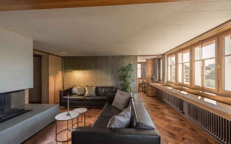 Spending the night here, with a unique view over the Appenzellerland as far as the Säntis, is an experience at any time of year.in the stylishly renovated, listed building on the historic village square of Rehetobel, old building fabric is combined with modernity. The stately five-storey building has served several purposes in its 230 years. Where there is now a pretty pub, the "Gasthaus Dorf5" with a beautiful garden, invites you to linger, there used to be the Rehetobel post office. The upper floors, which were used as a telegraph office and business premises, now house three flats with a high standard of finish. The spacious, light-flooded flat offers a 180-degree view, a beautiful balcony and a spacious living room with a fireplace. The bathroom and bedroom with dressing room and the open-plan kitchen are furnished to a high standard. The natural building fabric with historic parquet floors and selected materials are of a high aesthetic standard. The technical equipment and the special lighting concept leave nothing to be desired, and the central location in the Appenzeller Vorderland is ideal for exploring the Alpstein region, the nearby Lake Constance region and the extremely attractive city of St.Gallen. The flat offers plenty of space for two people and there are many cosy places to relax. Cooking in the modern kitchen is a pleasure - or would you prefer to be spoilt in the "Beizli" downstairs? for more than two people we recommend the flat "Kronbergblick" or "Säntispanorama" in the same house.Other sports and leisure facilities: Garden pool (2 min. walk from the house)Excursion possibilities: Rehetobel is an ideal starting point for many interesting excursions - be it to St. Gallen with its monastery district (UNESCO World Heritage Site) or to the Säntis massif with its mountain railways and hiking trails or to Lake Constance with its cosy little towns and beautiful beaches.Other kitchen equipment (Kitchen1): Dining table with corner bench in the living roomSports facilities in the area: mountaineering, ice skating, golf course, canoeing, climbing, mountain biking, paragliding, cycling tours, indoor riding arena, riding arena / riding facilities, tobogganing, rowing, skiing (alpine), skiing (cross-country), sports centre, squash, surfing, diving, tennis, water skiing, sailingVillage description: Rehetobel is considered the sunniest village in Appenzellerland. Whey spa and textile industry characterise the past. There are two local museums and several themed trails to explore.