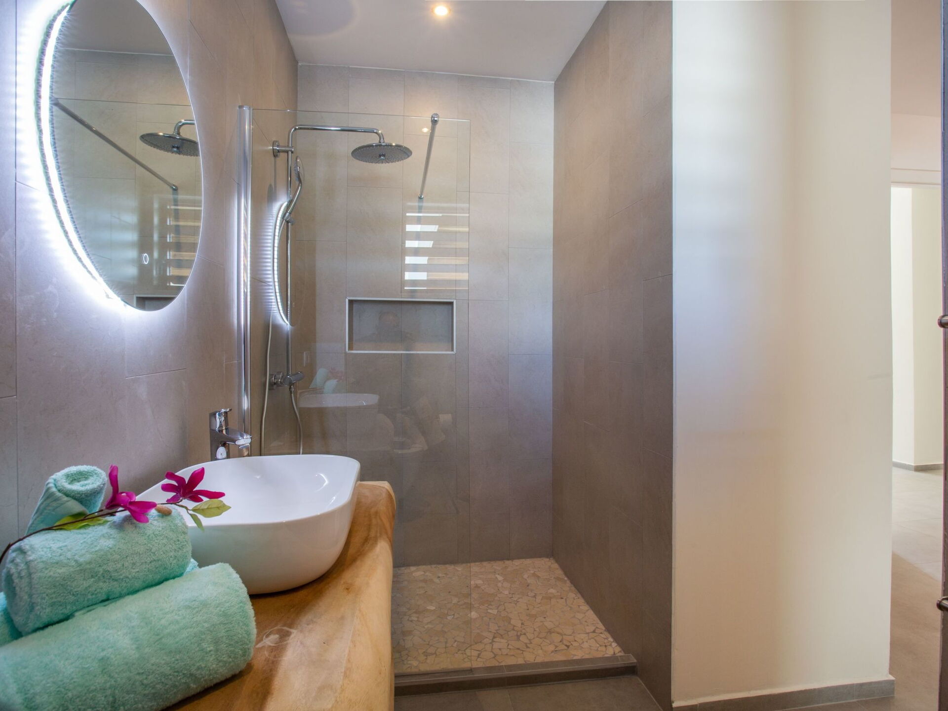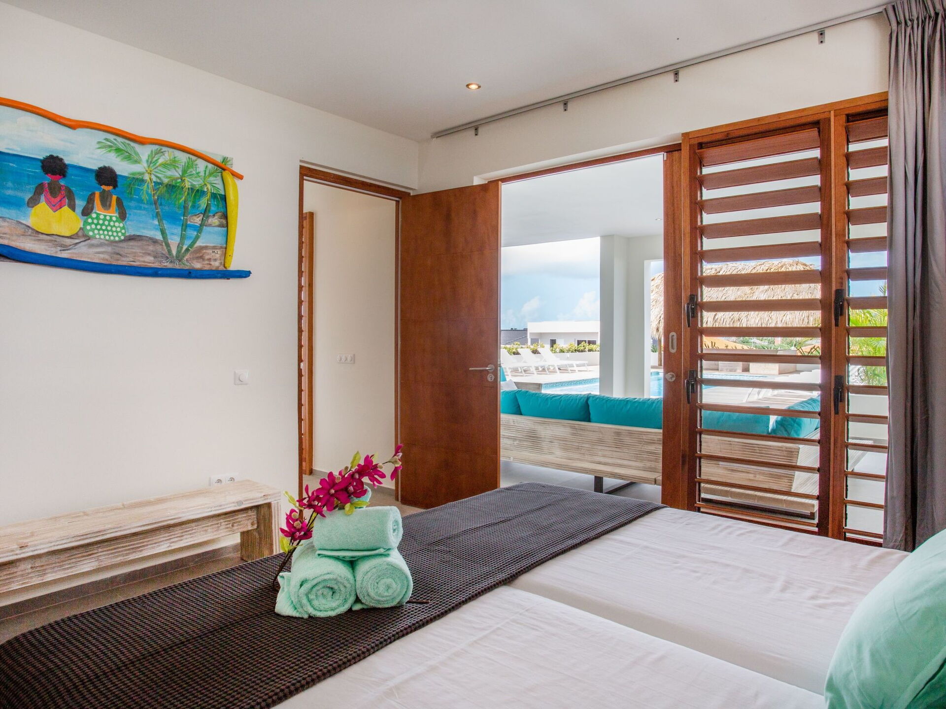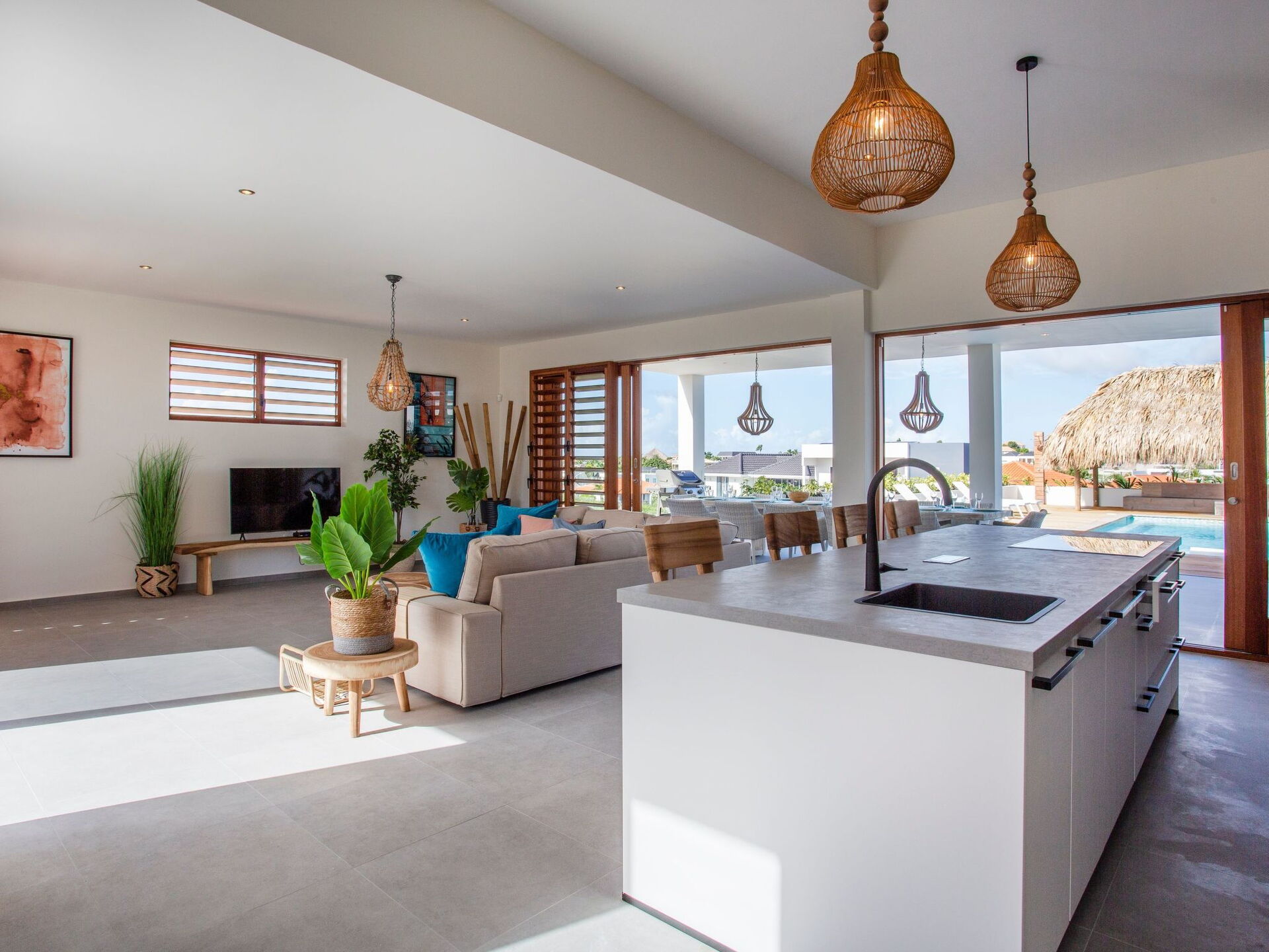 Staying in this new villa guarantees a unique experience and optimal enjoyment. The villa is located in the beautiful neighbourhood of Vista Royal, just a few minutes' walk from Jan Thiel beach. Here you will find peace, space and privacy. The spacious veranda, the private swimming pool with built-in sun loungers, is surrounded by a huge sun terrace. All (6) bedrooms have their own (6) bathroom. You have beautiful views over the neighbourhood and the sea.On the first floor are the swimming pool, a living roombedrooms, bathrooms, a pool terrace and a fully equipped, large kitchen. Staying on this floor gives you everything you could want. Around the large, beautiful pool, there is more than enough living space. The covered living terrace measures a whopping 65 square metres and is adjacent to the living room and master bedroom. Downstairs on the ground floor are five bedrooms and five bathrooms. Although the house is suitable for 12-15 people, you can also easily stay there with two. This is due to the special layout of the house, which consists of two floors.The villa is 400 metres from Jan Tiel beach and is in the middle of Vista Royal. A neighbourhood that has experienced tremendous growth in recent years due to the many resorts built there. It is a beautiful residential area where you can retreat in privacy but still be close to entertainment. This villa overlooks part of the neighbourhood and offers sea views.The villa is very suitable for families. Extra beds for children can be placed in the bedrooms. Cots are also available. Youth groups are not allowed, parties and loud music are not allowed.