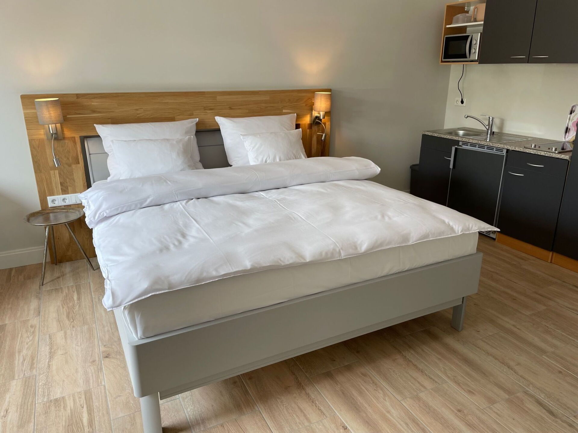 Discover idyllic Niebüll in Schleswig-Holstein with our comfortable holiday flats - the perfect accommodation for holidaymakers and Sylt commuters. Our holiday flats offer an attractive and cost-effective alternative to conventional hotel rooms. With excellent connections to Sylt, the option of digital check-in and check-out around the clock and special discounts for long-term guests, we make your stay as pleasant and flexible as possible. Whether you want to stay for a few nights or up to 12 months, our holiday flats are tailored to your needs.In each of our 30 m² holiday flats you will find everything you need for a relaxing stay. The flats have a cosy bedroom and living room with an integrated kitchen, equipped with a practical 2-plate cooker and a filter coffee machine for the perfect start to the day. Thanks to the underfloor heating, which provides cosy warmth throughout the flat, you will feel completely at ease even on cooler days. There is also a modern bathroom with a reliable shower, complemented by amenities such as a TV and WiFi for your entertainment and networking needs.Your holiday flat also has its own entrance and a cosy terrace where you can get some fresh air and relax. The highlight, however, is the charging station for electric cars, which gives environmentally conscious guests the opportunity to conveniently charge their vehicles. So you can start the day with peace of mind, whether you're exploring the local area or planning a day trip to Sylt.With its close proximity to the sea, which is only 10 kilometres away, the surrounding area is ideal for a variety of leisure activities. The nearest town centre is just a short 200-metre walk away, making this holiday flat the ideal starting point for exploring. Shopping facilities are also within easy walking distance, with a grocery store just 95 metres away. This makes your stay not only pleasant, but also extremely practical.Our holiday flats in Niebüll are therefore the perfect choice for anyone looking to enjoy the peace and beauty of northern Germany as well as the flexibility for trips to the island of Sylt. With environmentally friendly features such as the use of renewable energy and solar power, we also place great emphasis on sustainability. Experience an unforgettable stay in one of our holiday flats, where comfort, convenience and nature go hand in hand.
