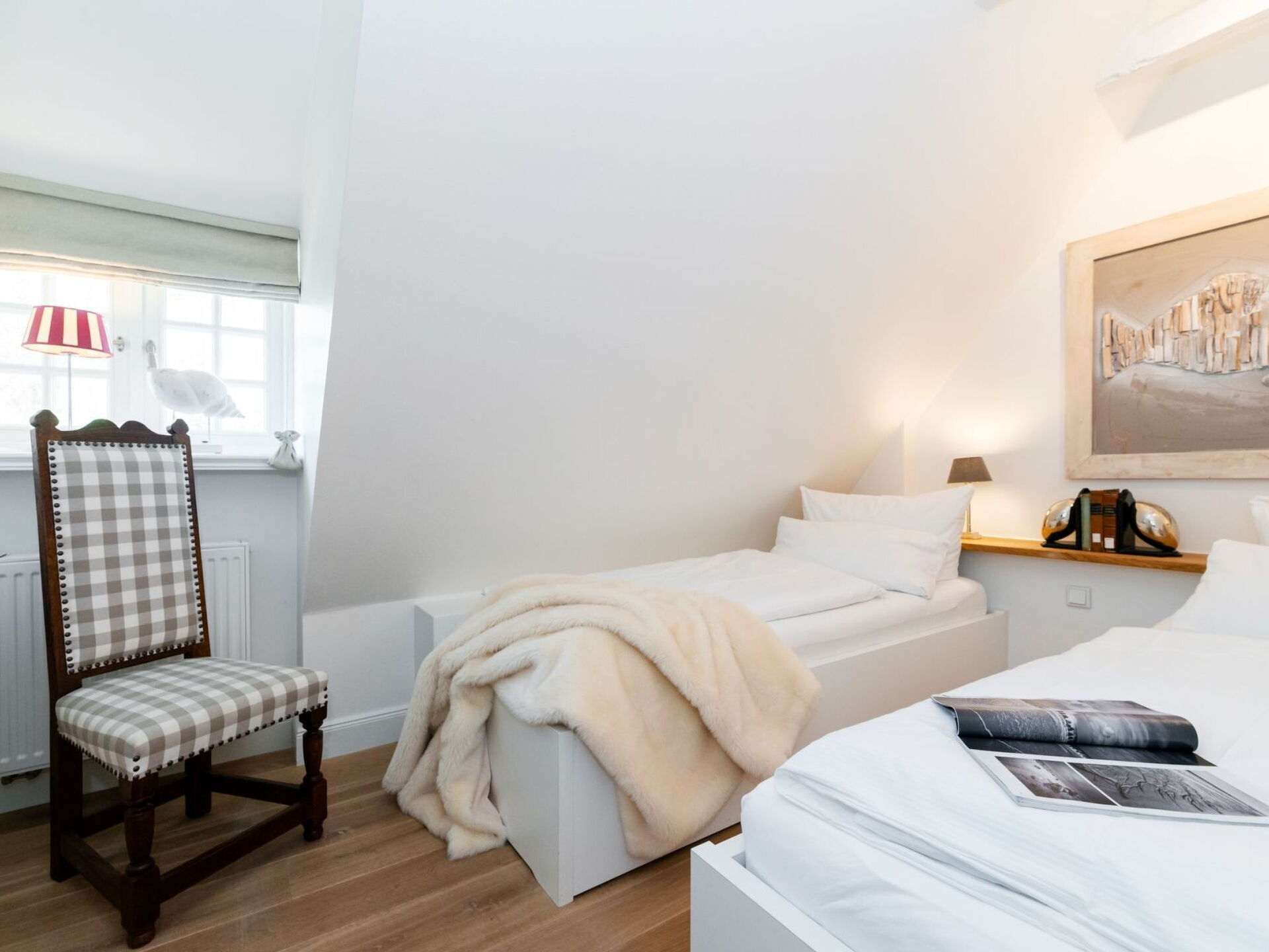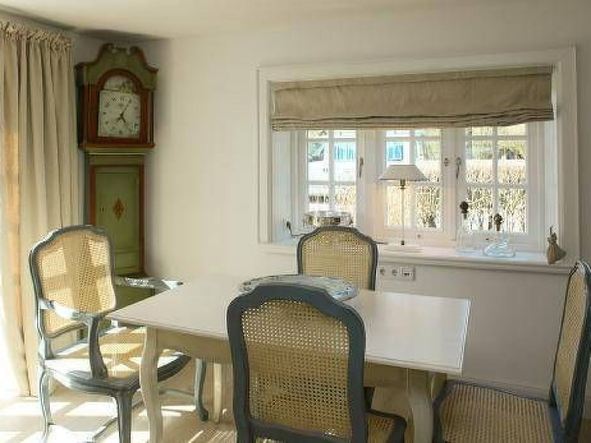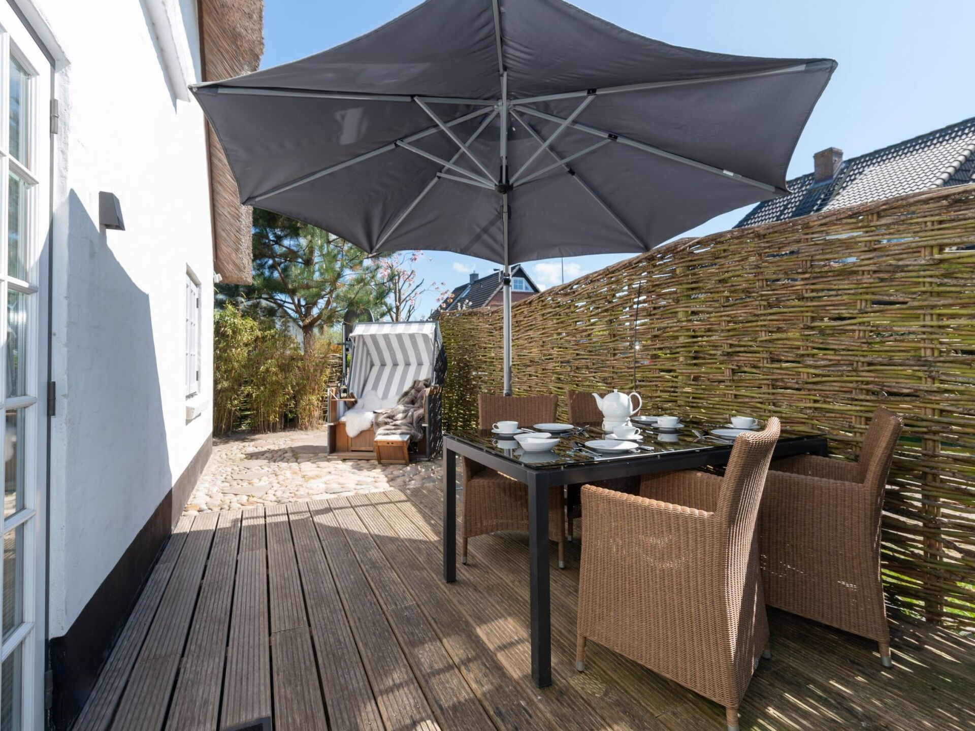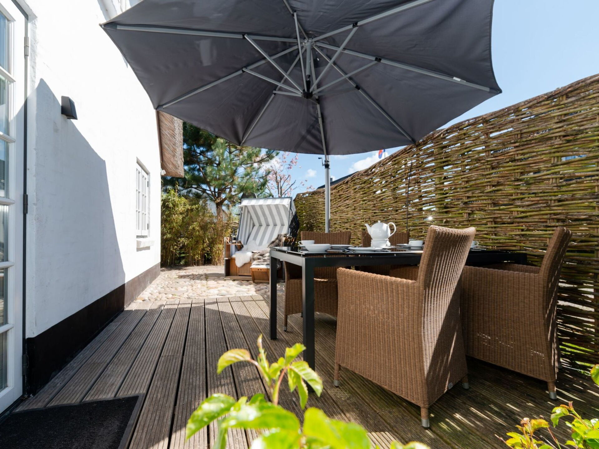 Permitido máximo 2 mascotas / perros. Very luxurious holiday apartment on two floors in a thatched house on a big plot of landThis holiday apartment is in a thatched house in a quiet location in the south of Tinnum on the island of Sylt.The apartment is in the south-west wing of the Treskersand country house and has around 110m² of living space spread over two floors. It provides ample space for up to five people. You enter this section of the house through an elegant Frisian door. On the left there are the fully-equipped country kitchen, a storage room with a washing machine and iron etc. On the right there is the big living and dining room with a traditional tiled fireplace stove. The bathroom has a big shower and a WC. There is an additional guest WC on the ground floor. The upper floor comprises two bedrooms, one with a big double bed, a sofa bed and an LED, the other with two single beds. There is another WC on this floor.Schlafcouch und LED Fernseher. Zwei getrennte Betten stehen im anderen Schlafzimmer bereit. Ein weiteres WC ist hier vorhanden.Outside there is a private garden with garden furniture, a canopy beach chair and loungers, accessed from the living room. There is also a private car parking space. The house is nestled quietly into a 1100m² garden.The apartment provides high-quality oak floorboards, a 100-year-old red stone wall, two LED TVs, wireless Internet access and under-floor heating. The kitchen has a Nespresso coffee machine. The apartment has been classified as 5-star luxury by the DTV. The Treskersand country house is currently one of the most beautiful restored thatched houses on the island of Sylt. It was comprehensively refurbished at the beginning of 2012.The accommodation enjoys a quiet location on the edge of Tinnum. There are shopping facilities about a kilometre away. The beach is about two kilometres away. It is a five-minute walk to the nearest bakery. The animal park in Tinnum is 750 metres away.