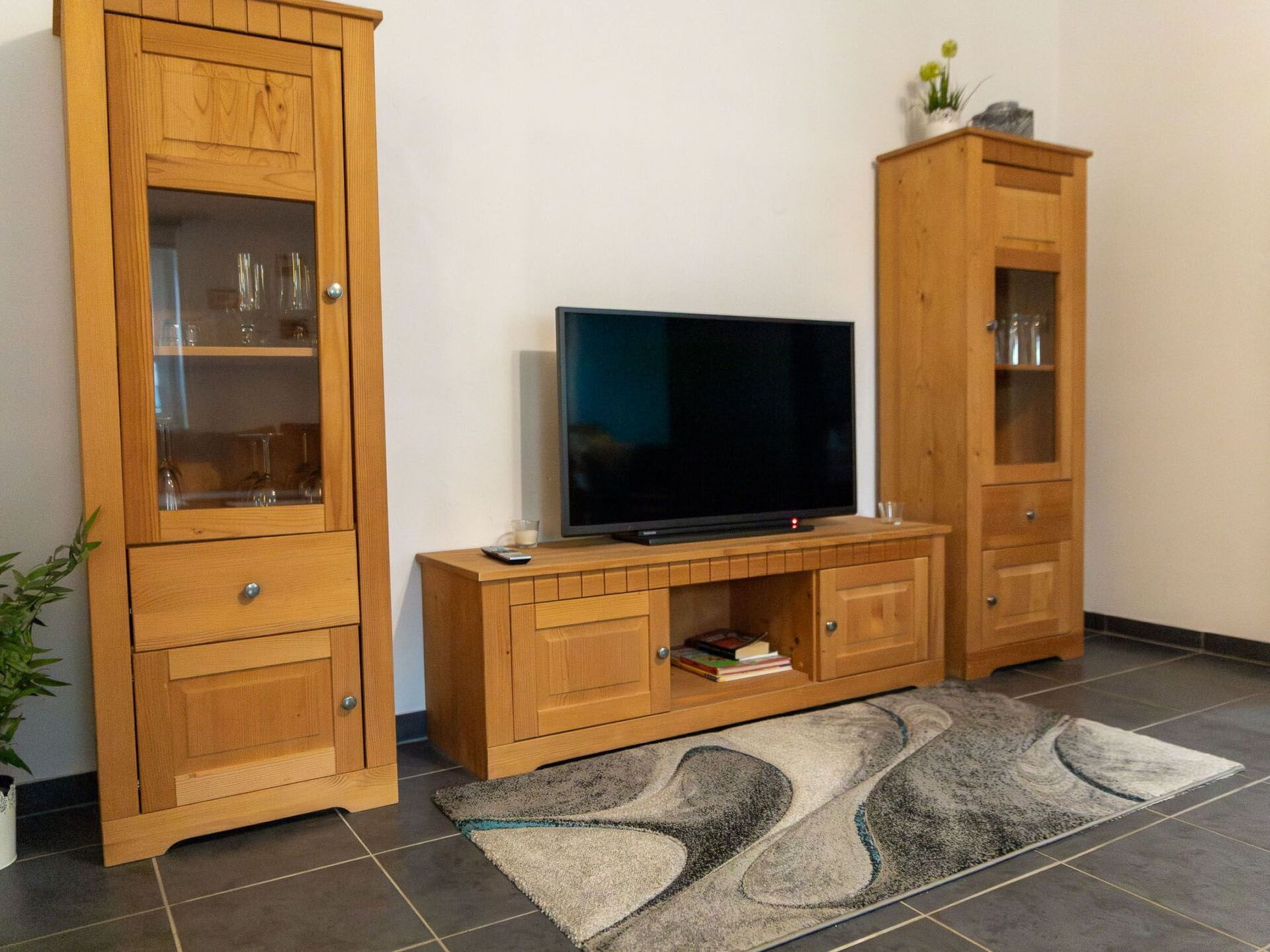 Permitido máximo 3 mascotas / perros. This holiday apartment freshly renovated in 2015, named Krümel after one of the ponies, is part of a riding farm with horses, ponies, donkeys, goats, hares, hens and ducks. It is on the first floor in the rear part of the farm, with a direct view of the barns. The 40m² apartment can accommodate four people. It consists of a well-equipped built-in kitchen with a stove, oven, coffee machine, toaster, kettle and fridge, as well as a living and dining room with a sofa bed (140 x 200cm). The bedroom has a box spring bed (140 x 200cm), a bedside table with a light and an old rustic wardrobe with a mirror on the door. The daylight bathroom is fitted with a shower and WC. The large living and dining room with a comfortable sofa invites you to relax after a day trip. Up to four people can sit at the dining table for meals together. There is a little built-in kitchen with a four-zone ceramic hob and oven, a built-in fridge with a freezer compartment, a coffee machine, toaster, kettle and everything you need for cooking.