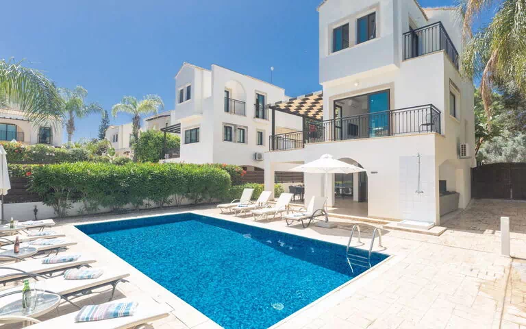 Close Beach 8/10 - Facilities 8/10 - Sea Views 5/10 - Our Rating 8/10 - Overall 8/10This lovely 5 bedroom villa with private pool is located in central Protaras, just 5 minutes walk from all amenities of the resort centre and the fabulous beaches.The villa is set out on three levels. The ground floor features an open plan dining and kitchen area with seating for 8 persons and a fitted kitchen with everything provided for a comfortable stay. Patio doors lead onto a large veranda which is ideal for outside dining and has views down towards the sea. The living room is situated at the back of the property, overlooking the pool area and features a comfortable sitting area with satellite TV and DVD player. There is also a WC on this floor.Upstairs, the villa has 3 bedrooms, 2 double rooms and a twin room all with fitted wardrobes and bedside tables. There is also a family bathroom with bath and overhead shower.Downstairs, the lower ground floor features 2 double bedrooms and a shower room. This floor also gives access to the garden and pool area which is spacious and sunny with plenty of room for sunbathing and relaxing. A covered area features a Ping-Pong table and there is also a shaded sitting area which is perfect for enjoying the warm summer evenings.The villa is perfect for a relaxing family holiday and an excellent choice for those who want to be close to all that Protaras has to offer.On the lower ground floor there is access to the garden and pool area which is spacious and sunny with plenty of room for sunbathing and relaxing.Downstairs, the lower ground floor features 2 double bedrooms and a shower room. The villa is perfect for a relaxing family holiday and an excellent choice for those who want to be close to all that Protaras has to offer. 0008956