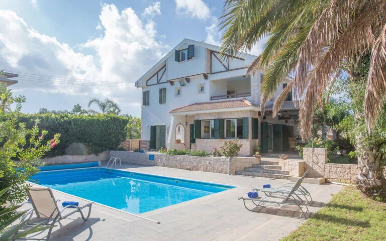 This charming 5 bedroom villa split over 3 floors is set in a private and quiet location close to both Kapparis and Pernera areas and with just a 5 minute drive to Protaras, it really is a great central location for exploring.This detached villa has a generous private pool and bathing area with outside BBQ, kitchen and dining areas, plus a grass area perfect for a game of football.Inside the villa is tastefully furnished and the open plan living, dining kitchen area makes it a great entertaining space. The fully fitted kitchen has everything you need for your self-catering stay and there is also a twin bedroom on this floor with doors leading outside to the patio and garden area, plus a separate WC.