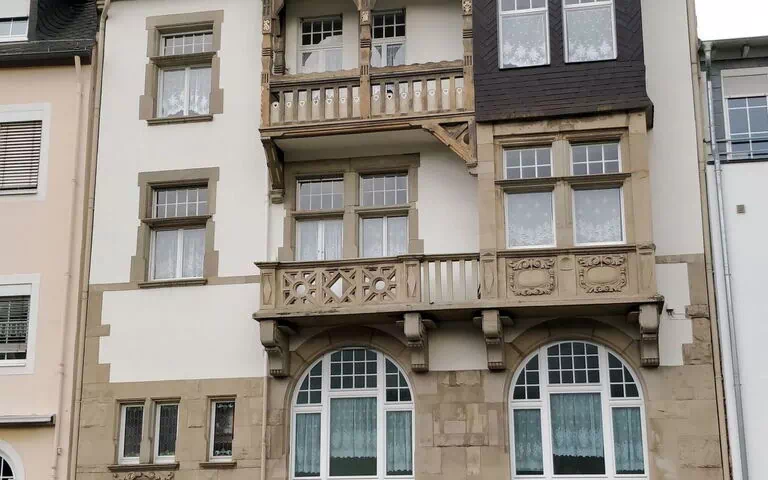 This holiday apartment is in a historical Jugendstil building at the heart of the old town of Zell an der Mosel.The holiday apartment is on the first floor and affords a view of the Moselle. There is also a bicycle storage room that is accessible directly from the road (Moselle side). There are many car parking spaces on the other side of the road, as well as on a directly adjoining parking area.The apartment has modern fittings. It has a separate WC and a bathroom with a shower bath. There are two bedrooms each with double beds. The cosy living room has two sofas and a TV. The high ceilings of 3.30m are typical of historical buildings. The separate built-in kitchen is equipped with an oven, four-ring hob, microwave, fridge with freezer compartment, sink, a dishwasher, coffee machine (Senseo and filter) and a dining space. A welcome wine is offered on arrival, as well as a Senseo coffee to recover from the journey. An iron and ironing board are available and there is free wireless Internet access throughout the house. The apartment features original wooden floors or natural parquet. Satellite TV/radio, a DVD player and HDMI connections are provided.The front side affords an unobstructed view of the beautiful Moselle. The rear side of the building is at the start of the Zell pedestrian zone with a view of the vineyards of the well-known wine-growing area “Zeller schwarze Katz”.