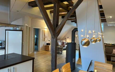 Discover the unique charm of a historic half-timbered house in Bruchhausen in the heart of the Sauerland, offering exquisite accommodation for up to 8 guests. This listed building, which impressively combines tradition and modern comfort, promises an unforgettable stay for family and friends. Let yourself be enchanted by the inviting atmosphere and the history that lies within the walls of this house.The interior of the holiday flat tastefully combines historical elements with the comfort you need for a carefree holiday. Each of the three complete flats offers a fully equipped kitchen and private bathrooms to ensure maximum privacy and comfort for all guests. There is also a washing machine and tumble dryer for your exclusive use. The central meeting point is the 5-metre-high lounge, which has a traditional fireplace for cosy hours.Outside, the garden for exclusive use invites you to enjoy the fresh Sauerland air. The terrace provides the perfect backdrop for shared meals or relaxed hours of socialising. This private retreat is ideal for enjoying nature in peace and quiet or simply escaping the stresses of everyday life.The house is located close to the centre of Bruchhausen, a charming village in the Sauerland region with direct access to its impressive mountain landscape. Just 3 kilometres away you will find a grocery store with all the supplies you need for your stay. The region offers a variety of outdoor activities and cultural attractions that will enrich your holiday.Stephan and Patricia warmly welcome you to this historic half-timbered house! Look forward to unrivalled days in Bruchhausen, where every detail is designed to provide you with an all-round enjoyable and memorable experience. Experience how history comes to life and enjoy the perfect balance of antique elegance and modern living comfort.