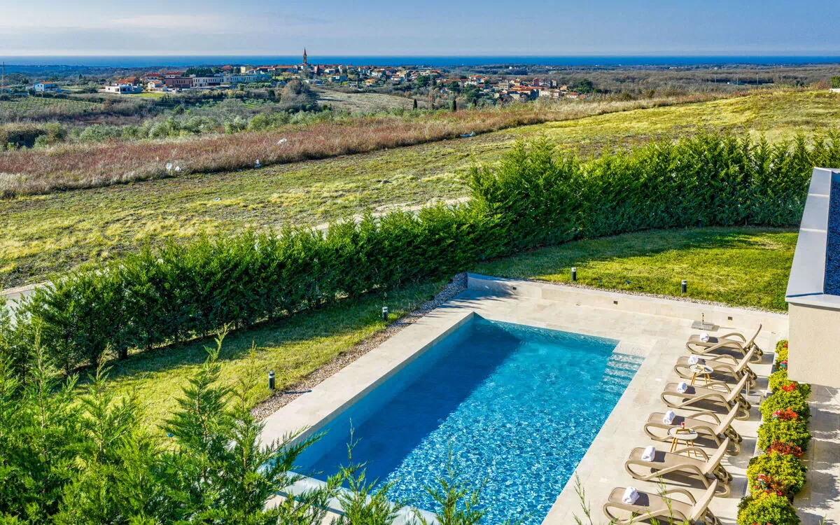 Brtonigla a 6 km de Buje: Villa "Miracle", moderna, bonita del año 2025. En el aldea Monte Marzari, a 1.2 km del centro de Brtonigla, a 10 km del centro de Novigrad, a 13 km del centro de Umag, lugar soleado, a 8 km del mar. Privado: terreno 1'150 m2 (vallada), jardín con césped, piscina rectangular, climatizada (10 x 5 m, 50 m2, 150 cm de profundidad, Disponible por temporada: 01.Ene. - 31.Dic.) con escalera interior. Ducha exterior. En el inmueble: acceso a internet, gimnasio, masaje (extra). Bañera de hidromasaje (todo incluido), sauna de rayos infrarrojos, aire acondicionado, alarma, lavadora, secadora. Aparcamiento (para 2 coches) junto a la casa en el mismo terreno. Tienda 1.2 km, supermercado 6.4 km, restaurante 1 km, parada autobús 1.4 km, playa de gravilla 8 km, centro de buceo 8 km. Campo de golf (18 hoyos) 20 km, minigolf 11 km. Atracciones en los alrededores: Aquapark 5.2 km. El propietario no acepta grupos de adolescentes/jóvenes. Piscina climatizada (extra). Hay que avisar con 7 de de antelación si quiere la piscina climatizada.