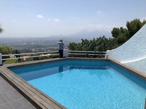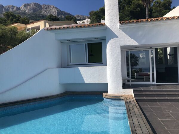 Altea Hills a 4 km de Altea: Villa "Palm Spring", amplia, moderna. A 7 km del centro de Altea, en el distrito Altea Hills, lugar tranquilo, elevado area residencial (villas), a 4 km del mar. Privado: terreno 1'800 m2 (vallada), jardín en diferentes niveles, cuidado, piscina (35 m2, Disponible por temporada: 01.Ene. - 31.Dic.) con escalera interior. Piscina con forma irregular. Terraza, muebles de jardín, barbacoa. En el inmueble: solarium, aire acondicionado, alarma. Garaje individual. Supermercado 3.5 km, restaurante 3 km, bar 3 km, playa de arena "Playa Levante Calpe" 13 km playa de gravilla "Playa Altea" 7 km. Puerto deportivo 6.7 km, puerto para yates 6.7 km, campo de golf (9 hoyos) 2 km, escuela de vela 6.7 km, tenis 2 km. Atracciones en los alrededores: Aqualandia, Mundomar, Terra Mítica, Terra Natura y Benidorm Palace (Benidorm). Zona de senderismo Sierra Bernia 10 km. A tener en cuenta: no adecuado para niños pequeños. Grupos de jóvenes sólo bajo petición. El propietario no acepta grupos de adolescentes/jóvenes.