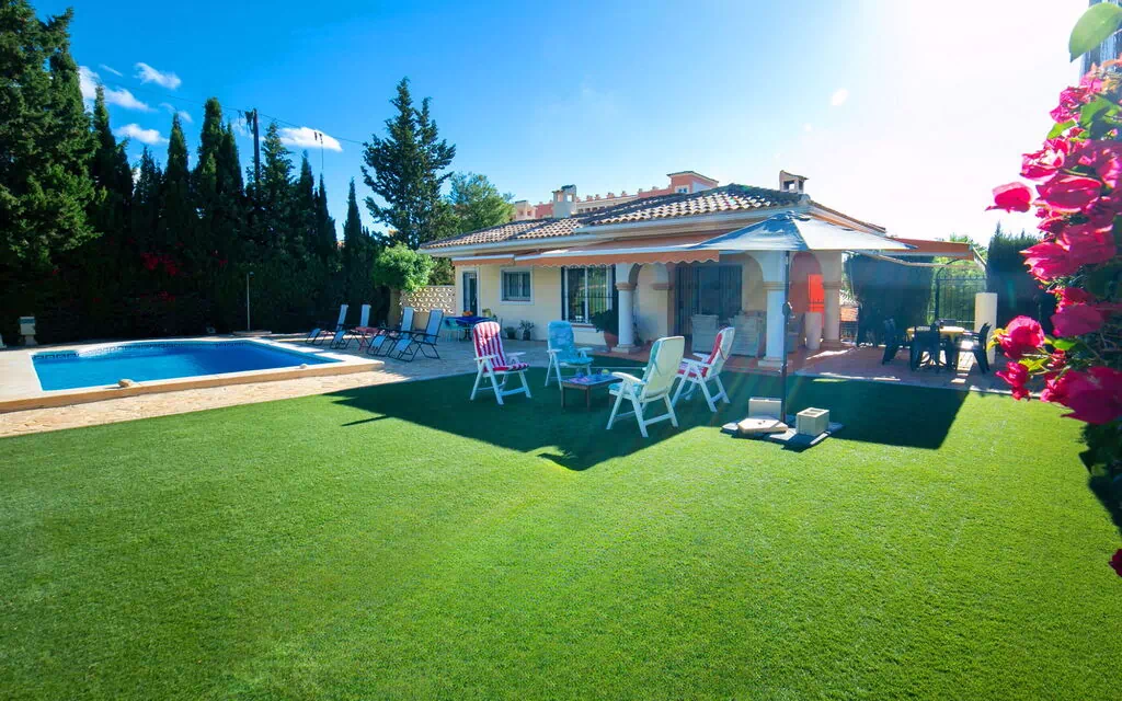 "Bonalba Golf, Urb. Los Naranjos", casa 4 estancias 168 m2 en 2 plantas. Espacioso y luminoso, con mobiliario muy confortable y de buen gusto: salón-comedor 31 m2 con chimenea, TV digital, DVD, calefacción eléctrica, calefacción de gas, aire acondicionado y bomba de calor, caliente. Salida a la terraza-jardín, a la piscina. Cocina abierta 10 m2 (4 fogones, lavavajillas, tostadora, hervidor de agua eléctrico, microondas, congelador, cafetera eléctrica). Salida a la terraza-jardín, a la piscina. Ducha/WC. Calentador (50 litros). En planta inferior: 1 dorm. 9 m2 con 2 camas (90 cm, 200 cm de longitud), ducha/WC. 2 dorm. 8 m2, cada habitación con 2 camas (90 cm, 190 cm de longitud). 2 ducha/WC. Calefacción eléctrica. Balcón 6 m2, terraza-jardín grande 30 m2, terraza-jardín grande 120 m2, jardín, césped 34 m2. Muebles de terraza, tumbonas (6). Vista al jardín, al paisaje y Campo de golf. El alojamiento dispone de: lavadora, caja fuerte, plancha, secador de pelo. Internet (Wifi, gratis). Plaza de aparcamiento. Permitido máximo 2 mascotas / perros. EGVT-593-A. AT-439801-A // Reg. Nr.: ESFCTU00000302400073367300000000000000000AT-439801-A5