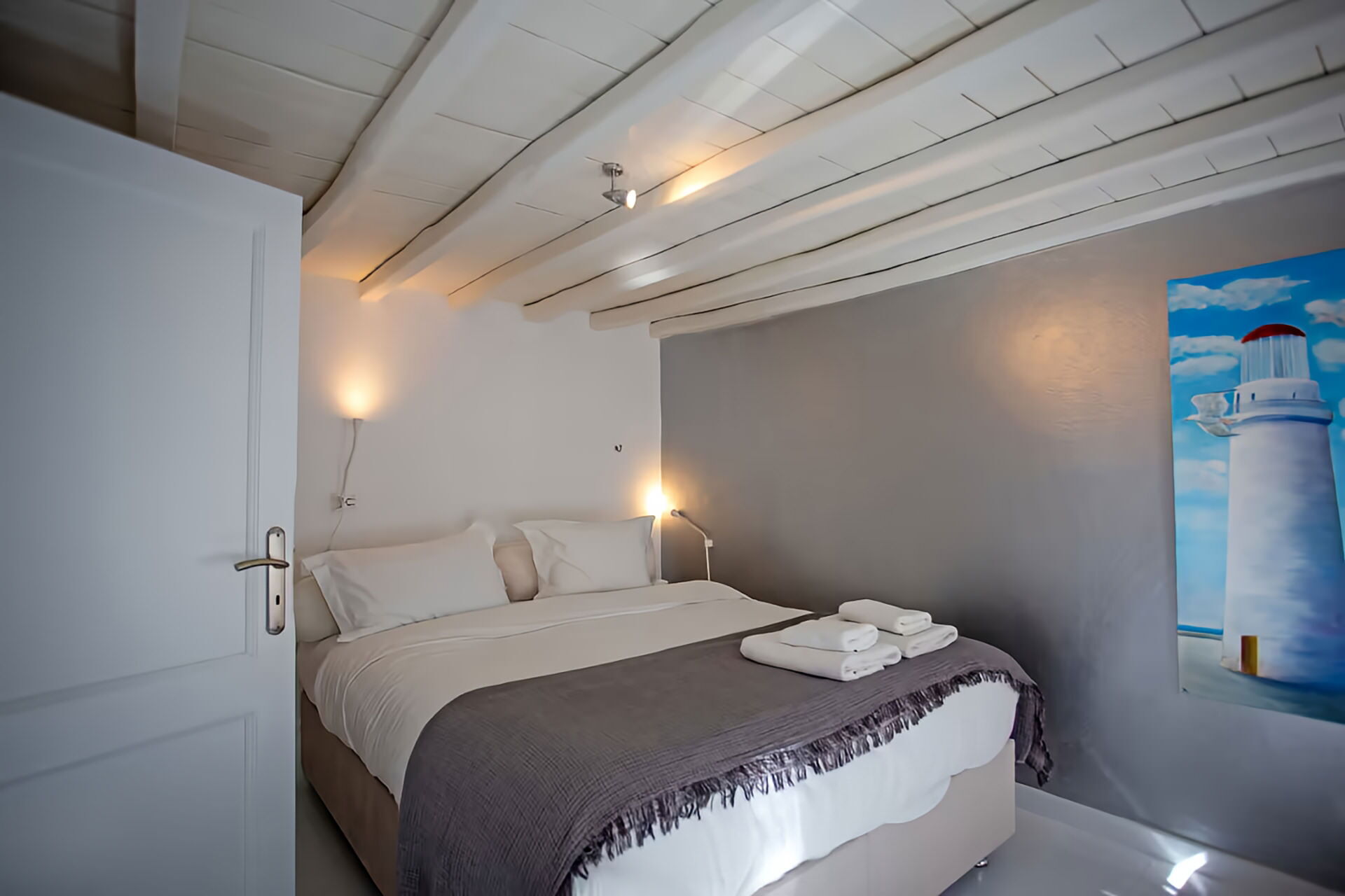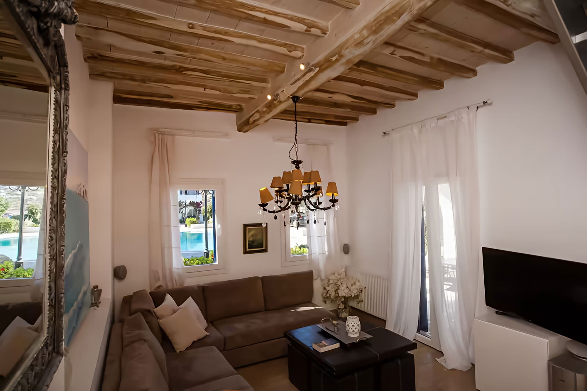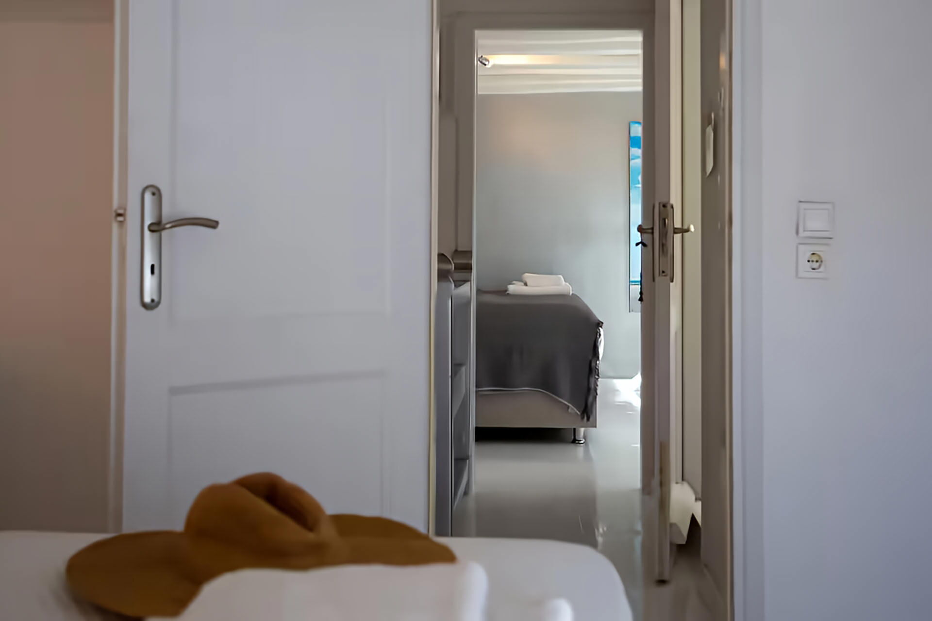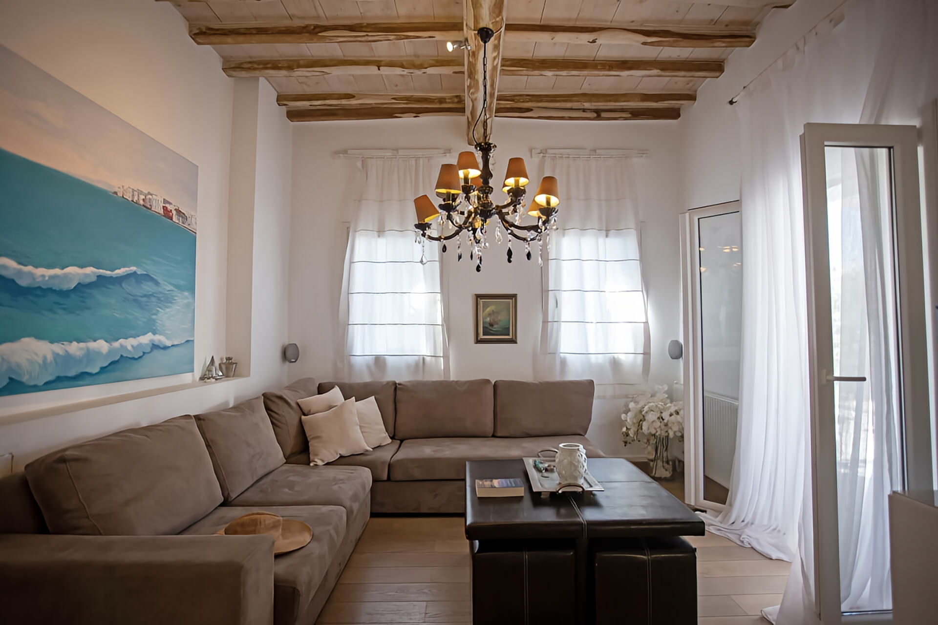 Korfos Beach, reconocida por sus condiciones ideales para windsurf y kitesurf, se encuentra a solo 150 metros de distancia, accesible en aproximadamente 3 minutos a pie. Las arenas doradas de Ornos Beach, bordeadas de beach clubs y opciones gastronómicas frente al mar, están a solo 400 metros de la propiedad.