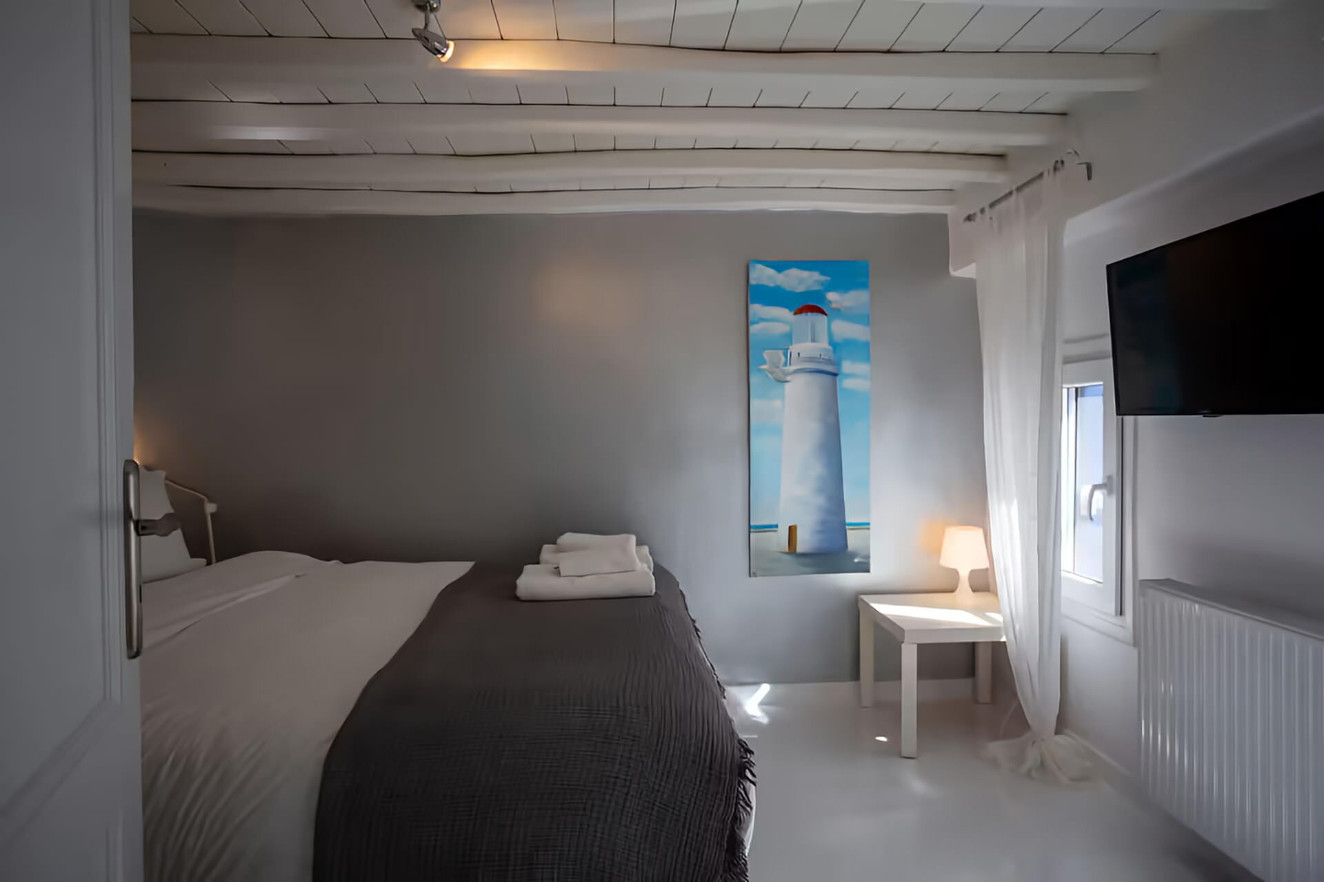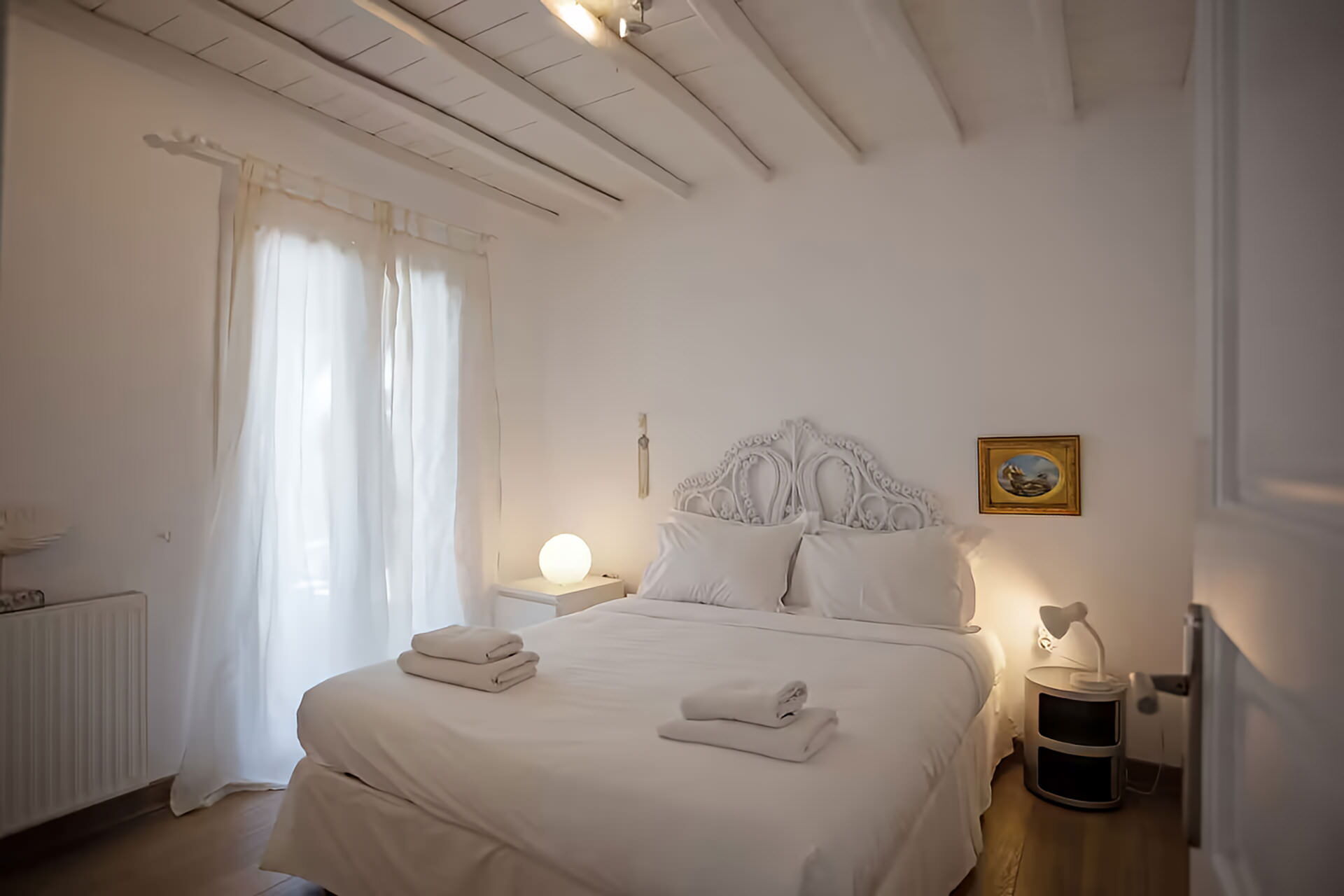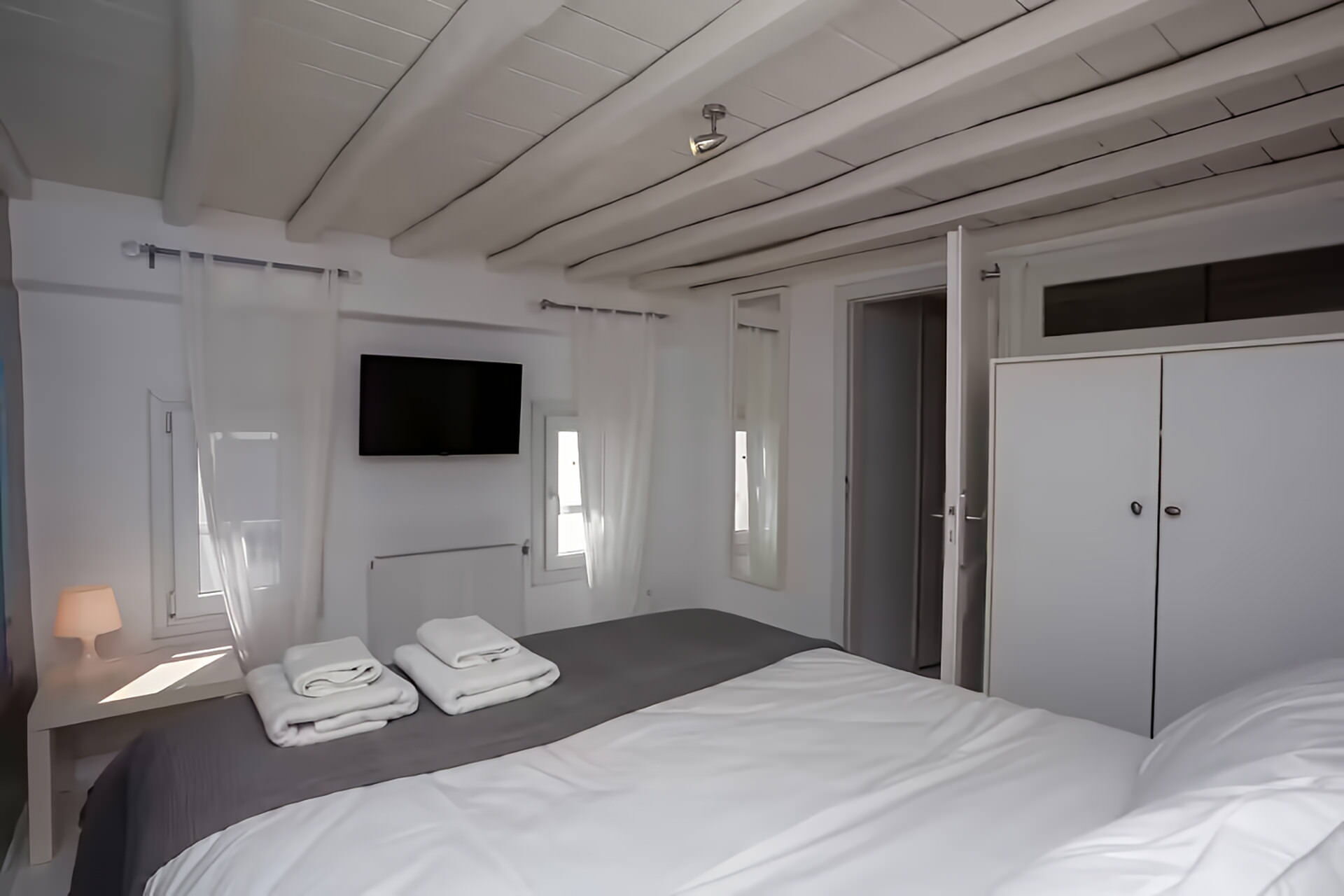 Korfos Beach, reconocida por sus condiciones ideales para windsurf y kitesurf, se encuentra a solo 150 metros de distancia, accesible en aproximadamente 3 minutos a pie. Las arenas doradas de Ornos Beach, bordeadas de beach clubs y opciones gastronómicas frente al mar, están a solo 400 metros de la propiedad.