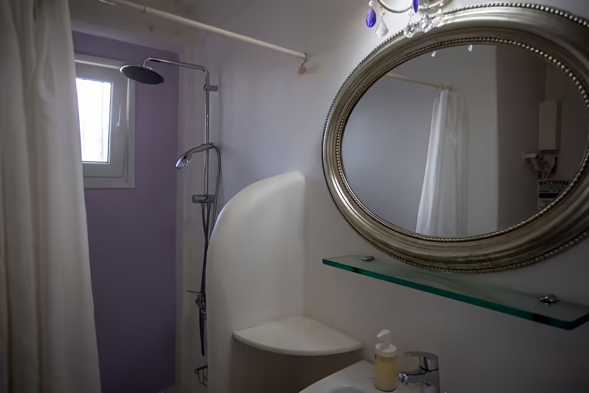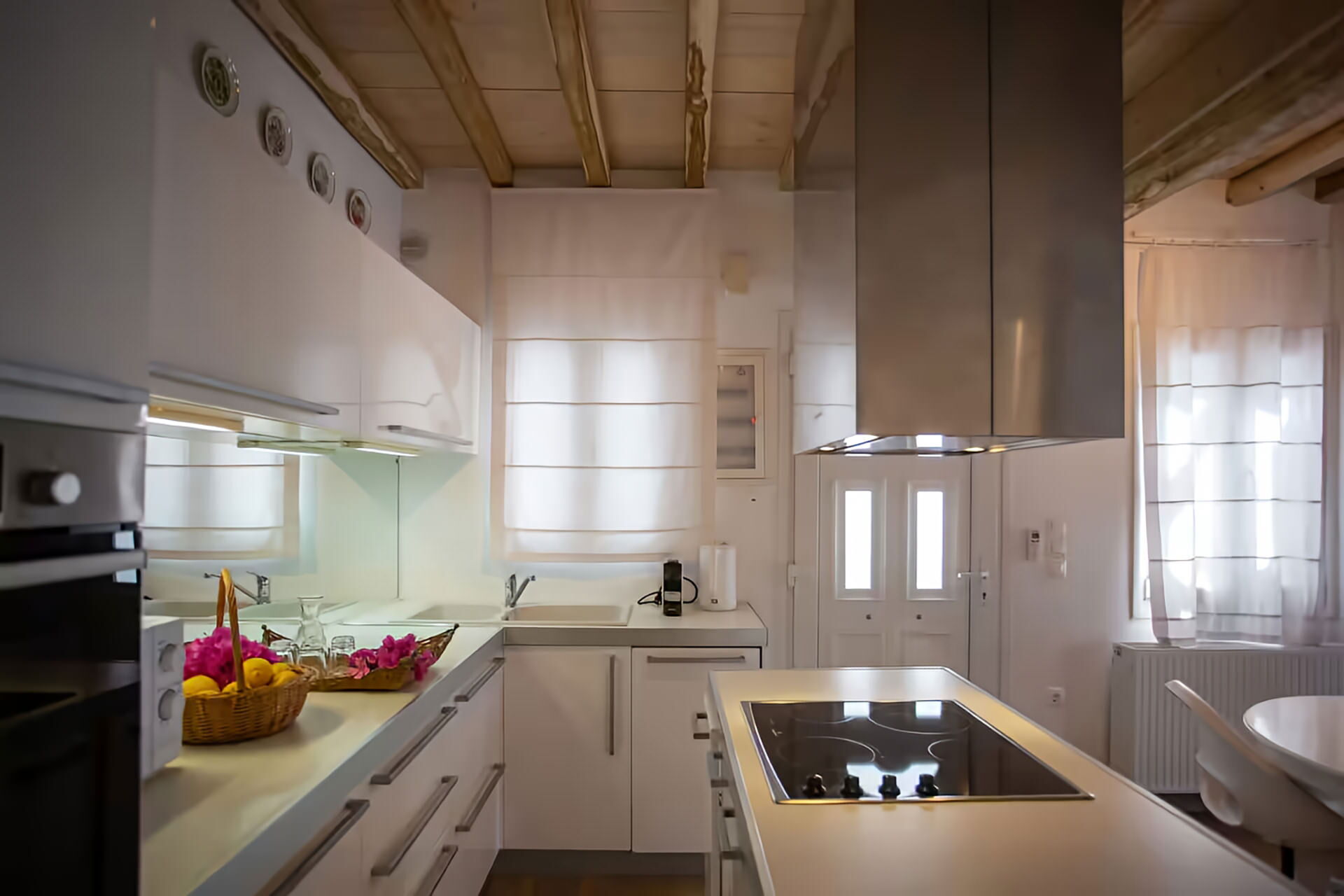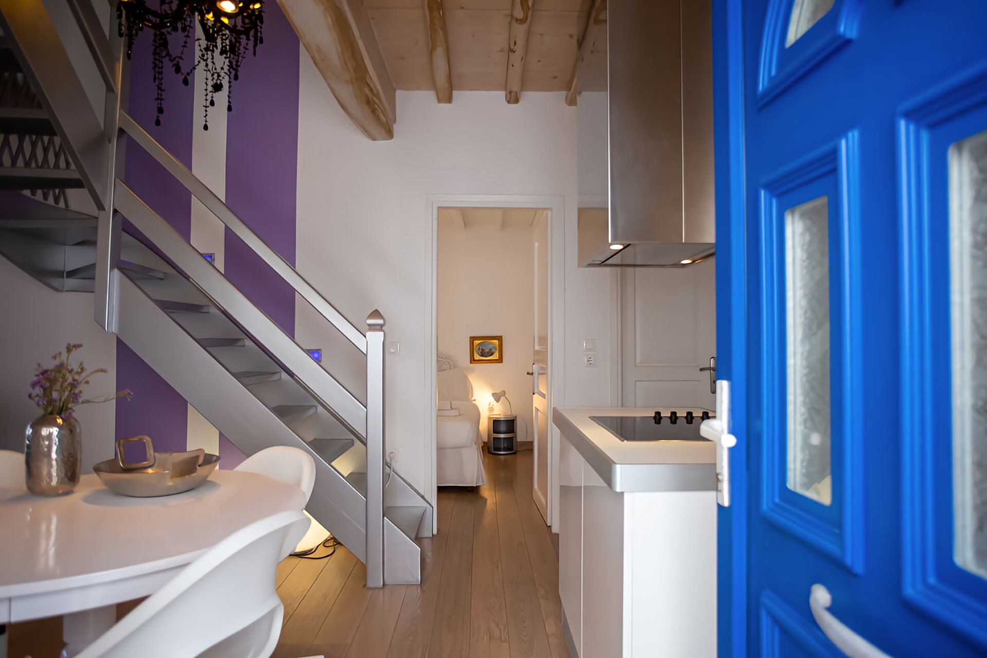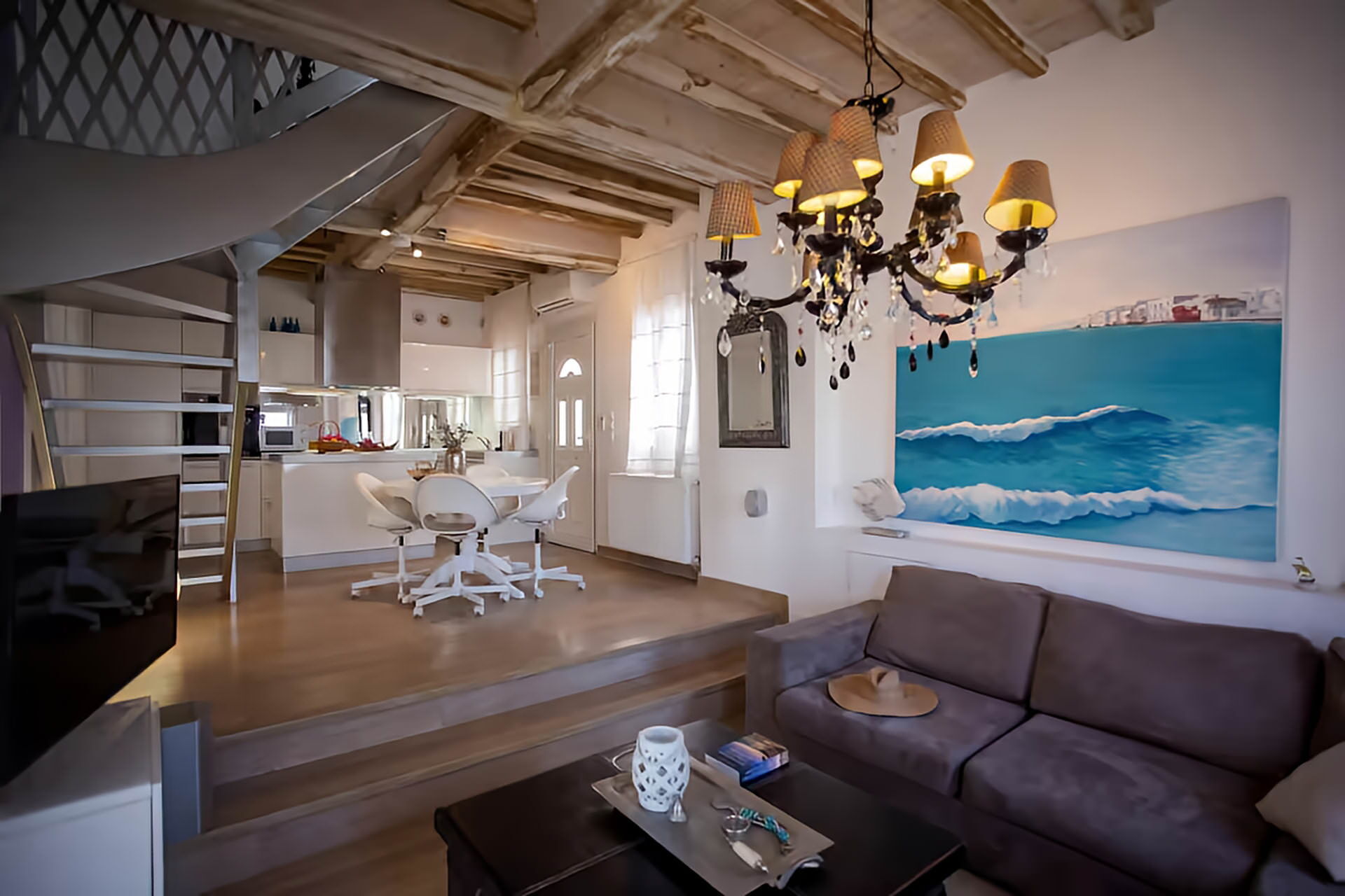 Korfos Beach, reconocida por sus condiciones ideales para windsurf y kitesurf, se encuentra a solo 150 metros de distancia, accesible en aproximadamente 3 minutos a pie. Las arenas doradas de Ornos Beach, bordeadas de beach clubs y opciones gastronómicas frente al mar, están a solo 400 metros de la propiedad.