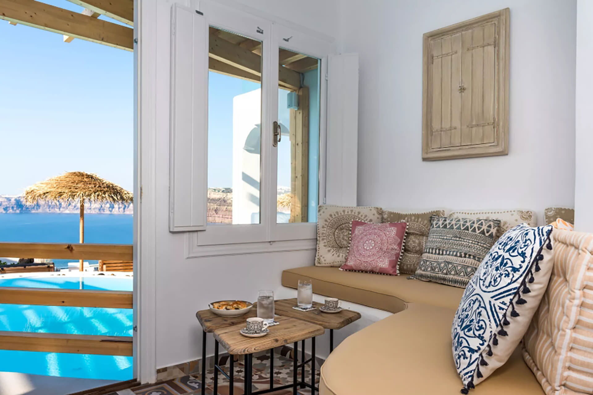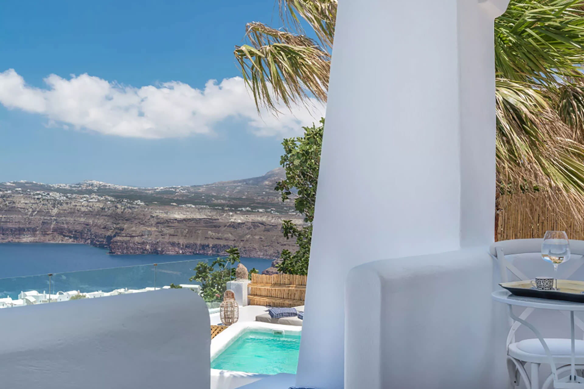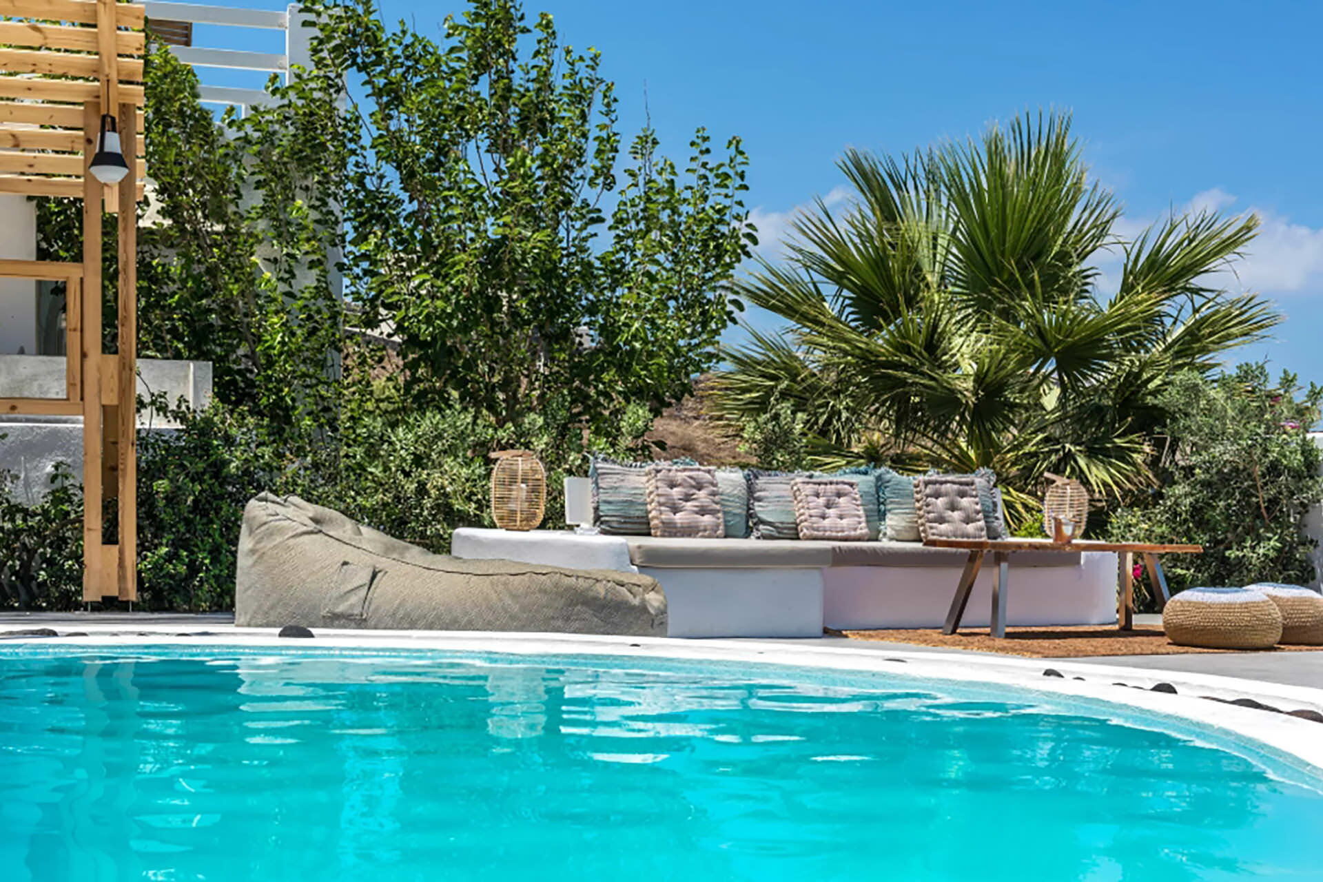 Los espacios exteriores de Villa Sean están diseñados para aprovechar al máximo el entorno natural. Una piscina privada es el elemento central, acompañada de tumbonas, mobiliario de terraza y una zona de comedor al aire libre con mesa de comedor, todo con vistas a la caldera y el mar. Un Jacuzzi exterior proporciona un espacio adicional para la relajación, mientras que un pequeño bar invita a los huéspedes a disfrutar del entorno. Una terraza exterior dedicada está disponible, adecuada para actividades como yoga o Pilates.