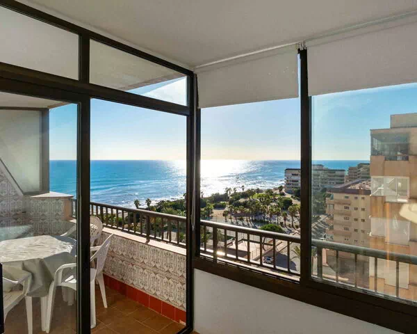 El apartamento "Miramar IV" tiene una superficie de 50 m² distribuida en 3 estancias, se sitúa en la novena planta y aloja un máximo de 4 huéspedes en 2 dormitorios y 1 baño. La zona de estar y comedor, de 12 m², está amueblada con mesa de comedor y comunica directamente con la terraza y la veranda. El primer dormitorio es una habitación amplia equipada con 1 cama francesa de 135 cm de ancho y 200 cm de largo, con acceso directo a la terraza. El segundo dormitorio es una habitación más pequeña con 1 litera de 90 cm de ancho y 200 cm de largo, adecuada para huéspedes más jóvenes. La cocina es una pequeña cocineta equipada con 3 placas de cocción de vitrocerámica, hervidor, cafetera eléctrica y calentador de agua con capacidad de 50 litros. El baño dispone de ducha y WC. El apartamento cuenta con una terraza amplia de 14 m² amueblada con mobiliario de exterior.