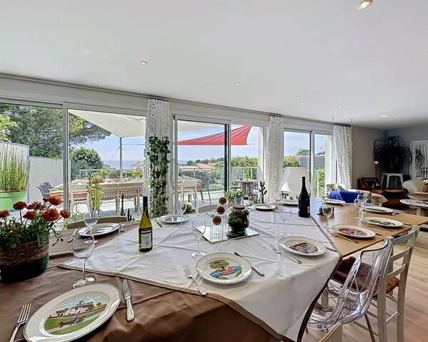 La villa "L'Incroyable Océane" ocupa 275 m² distribuidos en 2 plantas y aloja un máximo de 15 huéspedes en 7 dormitorios y 5 baños. La orientación sur de la propiedad proporciona luz natural abundante durante todo el día.