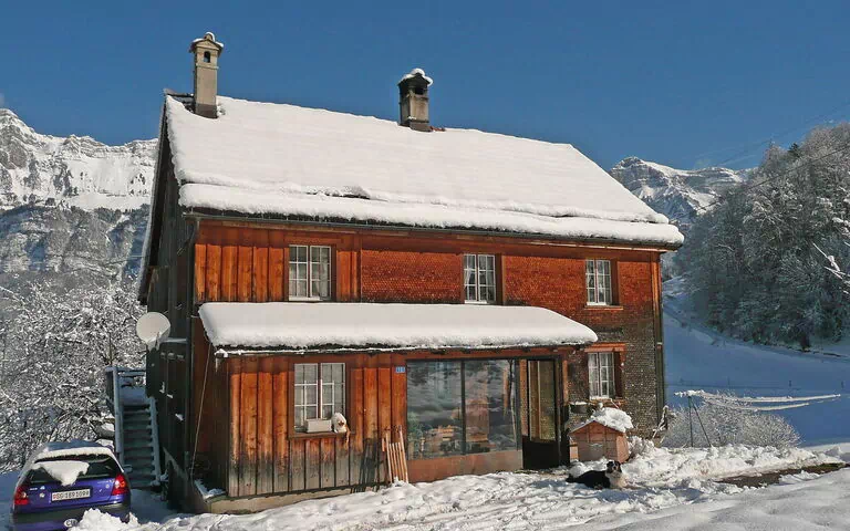 El apartamento Bünten es una vivienda de 55 m² distribuida en 2 plantas, ubicada en la primera planta de un edificio, con capacidad máxima de 5 huéspedes y 2 dormitorios y 1 baño. La planta baja alberga la cocina y la sala de estar, accesibles desde la entrada principal mediante escaleras, con mesa de comedor para las comidas y el descanso. La primera planta, a la que se accede por una escalera empinada, contiene una zona de dormir y estar abierta dividida por una cortina, equipada con 3 camas, y un dormitorio separado con 2 camas. El baño dispone de ducha y WC. Los suelos de madera confieren calidez y carácter natural al interior. La zona de dormitorio es accesible únicamente mediante una escalera empinada sin barandilla; por esta razón, el apartamento no es recomendable para personas mayores ni niños pequeños.