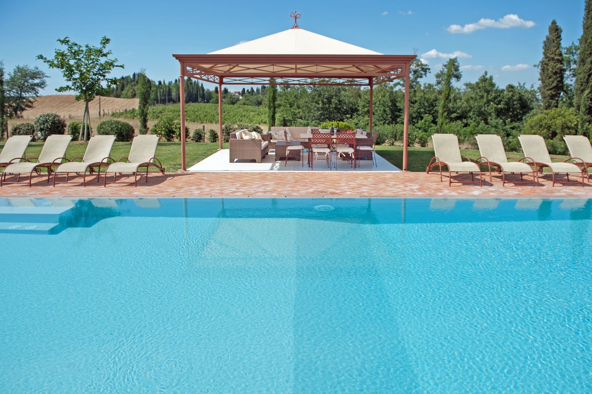 We were a party of 8 (four couples) and this Villa was fantastic!! It exceeded our expectations. The photos represent the villa perfectly. It was very clean and beautifully decorated. Appliances worked very well. We loved sitting out by the pool in the evening. The owners were very welcoming and made sure that we had everything that we needed. They were very helpful and arranged a wonderful dinner for us at a local restaurant. It was situated very well for day trips to Pisa, Firenze, Volterra, San Gimi, Sienna etc. Save time to enjoy this property though!!