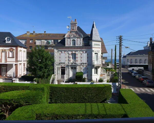 La villa se encuentra a tan solo 100 metros de la playa. El entorno del balneario ofrece un ambiente agradable y refinado, característico del encanto costero atemporal de Cabourg. El acceso exterior al edificio refleja la grandiosidad de esta residencia histórica.