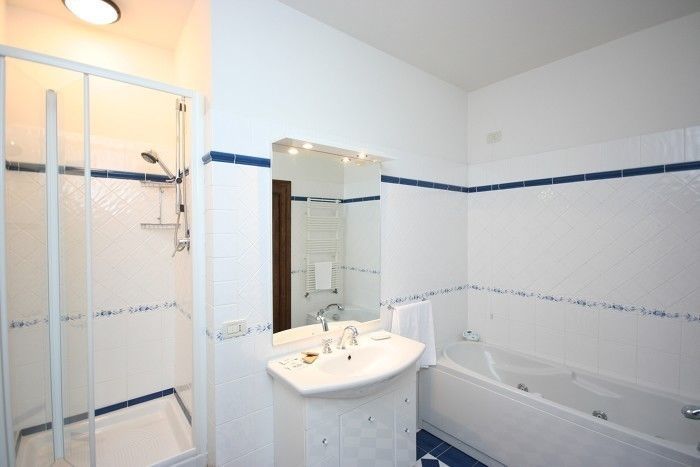 1° Piso : Saletta /desempeño con 2 butacone, chimenea, acceso a una grande terrazza cubierta ( 15 m2- accesible tambien del jardìn) con optima vista, 2 cuarto de matrimonio con baño privado /ducha, 2 cuarto cada uno 2 cama personal y baño privado/ducha.