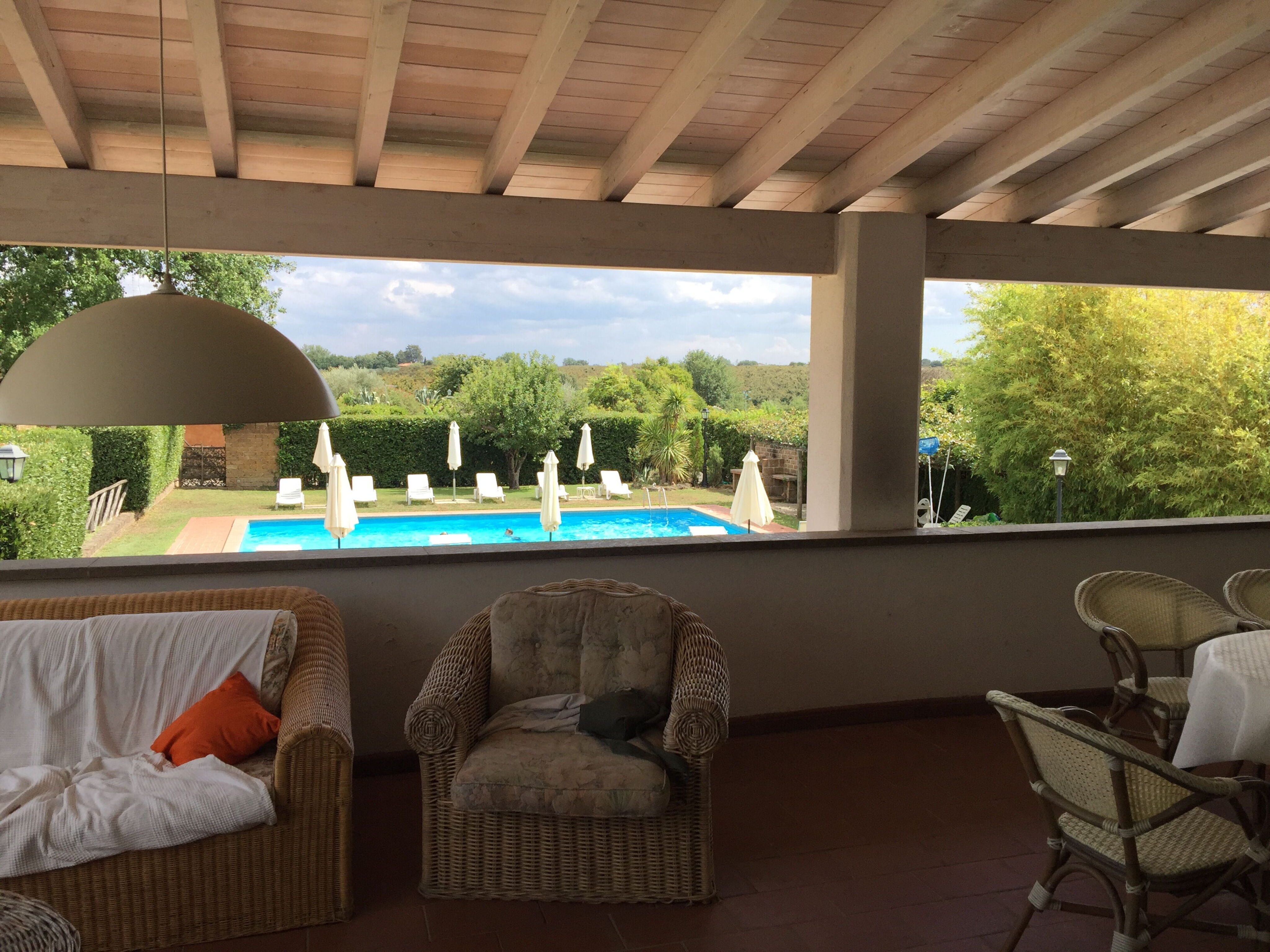 From the living room access to a large covered terrace overlooking the swimming pool and very panoramic, furnished with tables and chairs, ideal for outdoor dining.