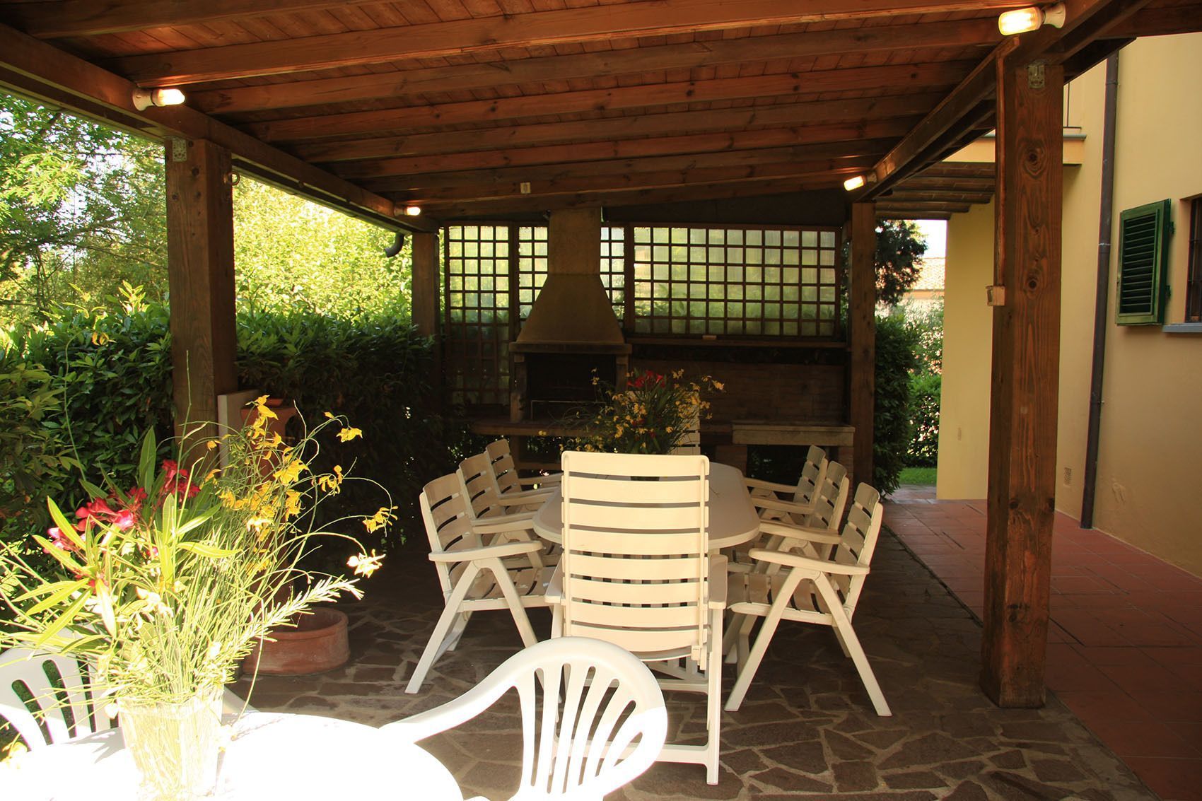 From the hall you can also enter the newly designed kitchen with four-ring kitchen hob, dishwasher, oven, fridge, freezer, washing machine and dryer and access to the external covered terrace with table, chairs and barbecue for a traditional Tuscan "arrosto" (grill).