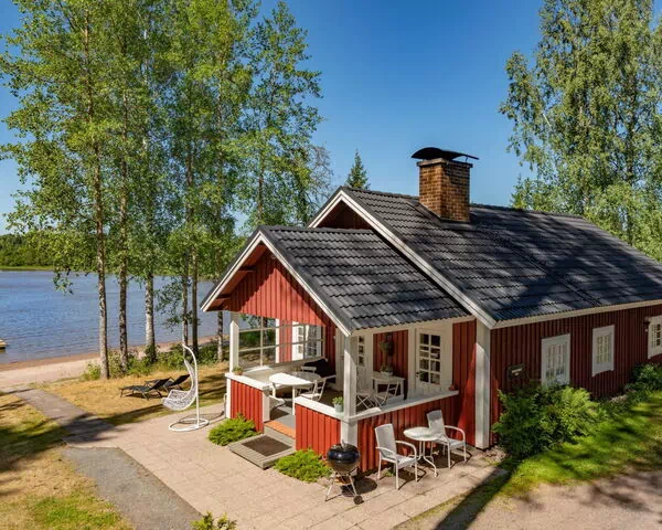 Los espacios exteriores se caracterizan por un patio llano que desciende naturalmente hacia la orilla del agua. Una playa de arena ancha y poco profunda proporciona un lugar seguro e invitador para nadar y relajarse. Un embarcadero privado se extiende sobre el lago, perfecto para pescar, nadar o simplemente disfrutar de la calma del agua; hay un bote de remos disponible para que los huéspedes exploren el lago. Una terraza cubierta ofrece un área protegida para comer y descansar al aire libre, independientemente del clima. Desde la terraza se accede a una sauna finlandesa tradicional de leña, que cuenta con una ducha en la sala de vapor y ofrece una experiencia auténtica y relajante. El paisaje circundante es rico en zonas de recolección de arándanos y setas.