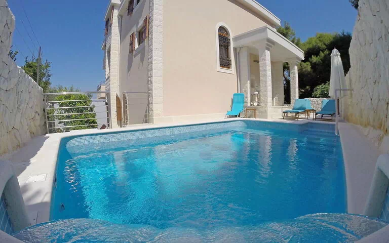 Okrug Donji a 8 km de Trogir: Casa unifamiliar "Villa Mustra", de 4 plantas. Lugar tranquilo, soleado, a 30 m del mar, a 30 m de la playa. Privado: terreno 360 m2 (vallada), piscina rectangular (5 x 3 m, 18 m2, 150 cm de profundidad, Disponible por temporada: 19.May. - 27.Oct.) con escalera interior. Ducha exterior, piscina de hidromasaje, terraza (20 m2), muebles de jardín, barbacoa. En el inmueble: acceso a internet, billar, calefacción central, alarma, lavadora, secadora. Aparcamiento (para 2 coches) junto a la casa en el mismo terreno, posibilidad de aparcamiento. Tienda 1 km, restaurante 5 km, parada autobús 1.2 km, playa de gravilla 700 m, playa rocosa 30 m. La casa consiste de 2 apartamentos en alquiler como una unidad.