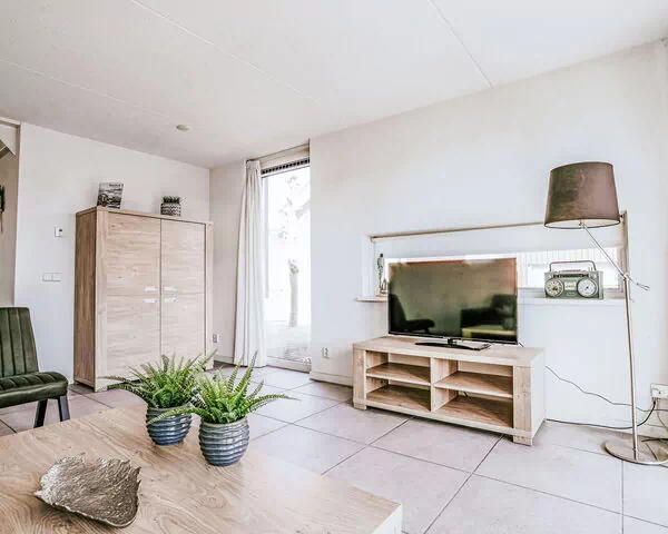 La casa de vacaciones "Dorregeest" es una vivienda unifamiliar adosada de 90 m² distribuida en 2 plantas, con capacidad para 4 huéspedes, 2 dormitorios y 1 baño. La planta baja comprende un vestíbulo de entrada con aseo independiente, un amplio salón comedor con mesa de comedor y zona de estar, acceso directo a la terraza, y una cocina abierta integrada en el espacio de convivencia. La primera planta, caracterizada por techos abuhardillados que crean una atmósfera acogedora, alberga 2 dormitorios dobles equipados cada uno con 2 camas, y un baño con bañera o ducha y aseo.